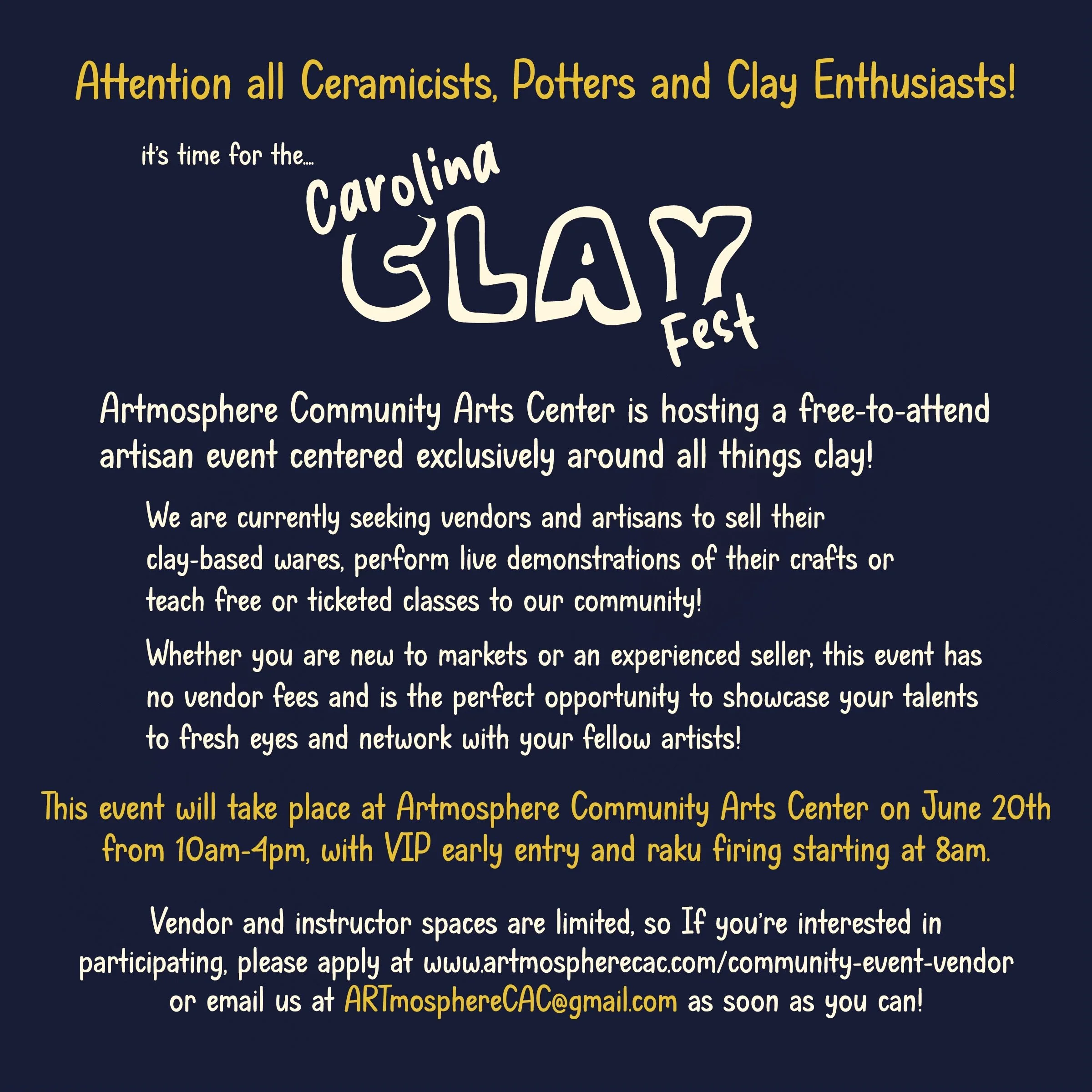 Please apply and fill in application to be considered by 5/31st. Booth fee is $0. Limited Space. Only Artisan Clay Vendors are accepted. Vendors will be notified via email as they are accepted. Thank you for your interest.